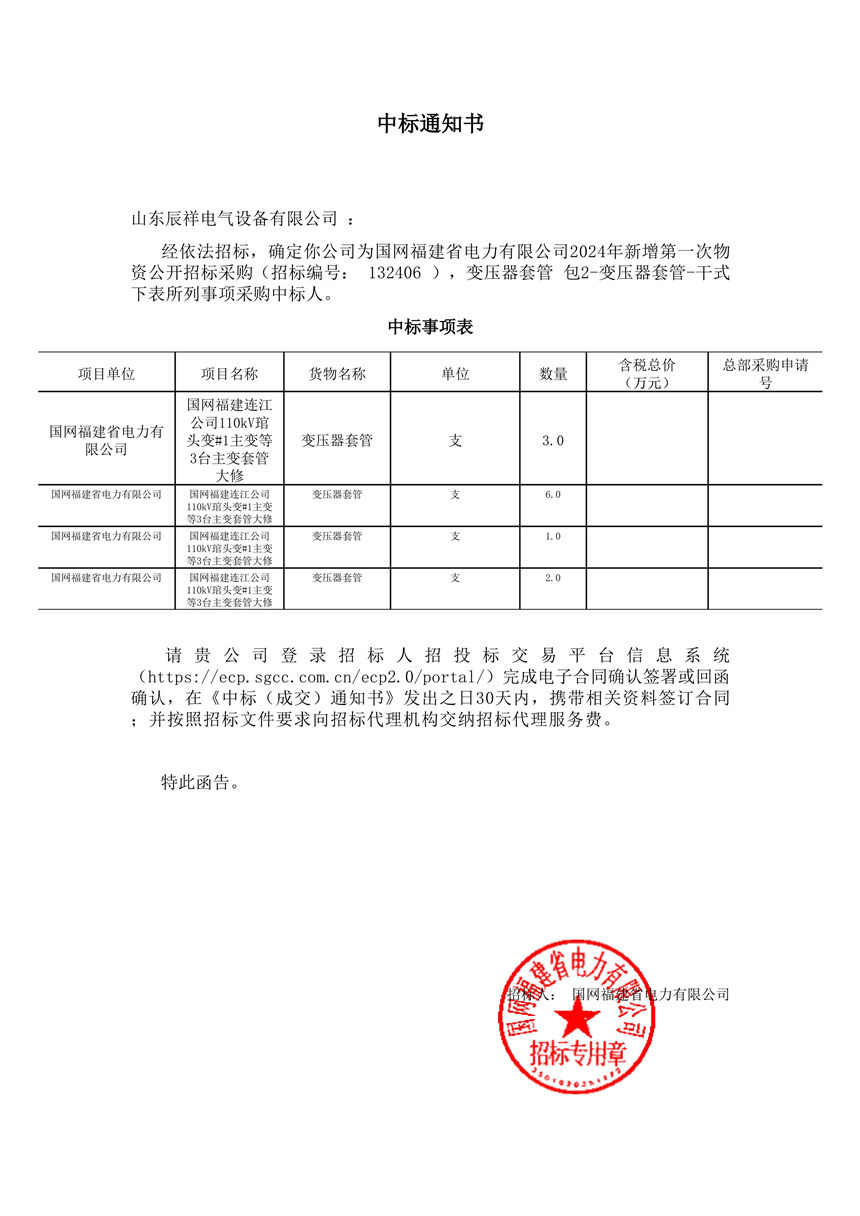 交流穿墻套管中標(biāo)通知書